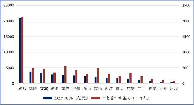 我们看一看四川“古城”序列以所在市州范围为经济腹地的人、财数据:从GDP总量看,2022年成都正式迈入“GDP两万亿元俱乐部”(中国内地第7个)。同期,四川“GDP两千亿元俱乐部”达到9个(成都、绵阳、宜宾、德阳、南充、泸州、达州、乐山、凉山)。从“七普”人口数字看,成都常住人口突破2000万大关。常住人口在500万人至600万人之间的市州有2个,依次是南充市、达州市;常住人口在300万人至500万人之间的市州有8个,依次是绵阳、凉山、宜宾、泸州、德阳、广安、乐山、内江。