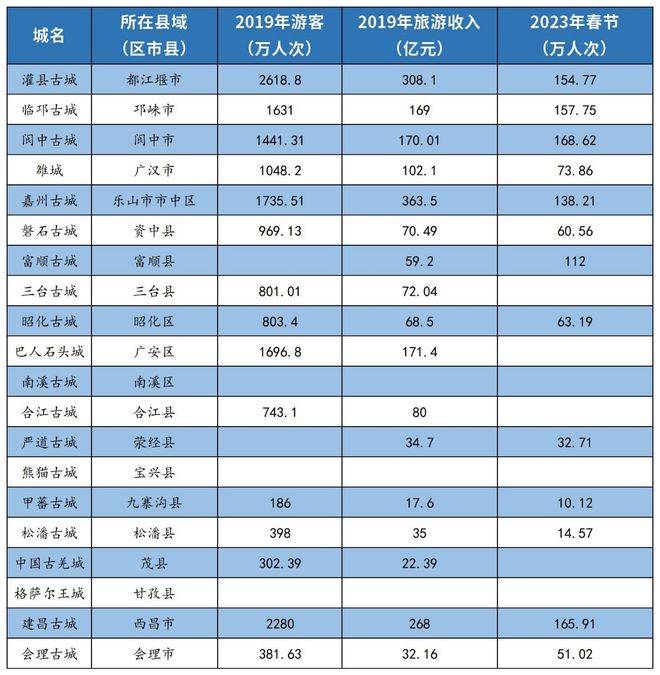 (二)上述古城所在区市县2019年旅游总收入突破100亿元大关的按体量依次是:乐山市中区(嘉州古城)、都江堰市(灌县古城)、西昌市(建昌古城)、广安区(巴人石头城)、阆中市(阆中古城)、邛崃市(临邛古城)、雒城(广汉市);