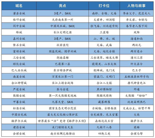 我们从古城A级(或者主要依托区域的代表性A级)、世界自然或文化或灌溉工程等遗产拥有量、全国性文保单位数量、2019年(疫情之前)区市县域游客量、2019年度旅游收入、2023年春节期间游客量、是否当选天府旅游名县等多个角度观察,认为四川省内“五大片区”的十大代表性“古城”应该如下: