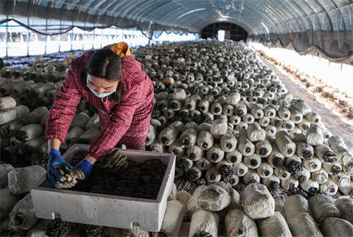菇香满棚,延庆区沈家营镇下花园村蘑菇长势良好,菇农忙采收 赵粤来摄
