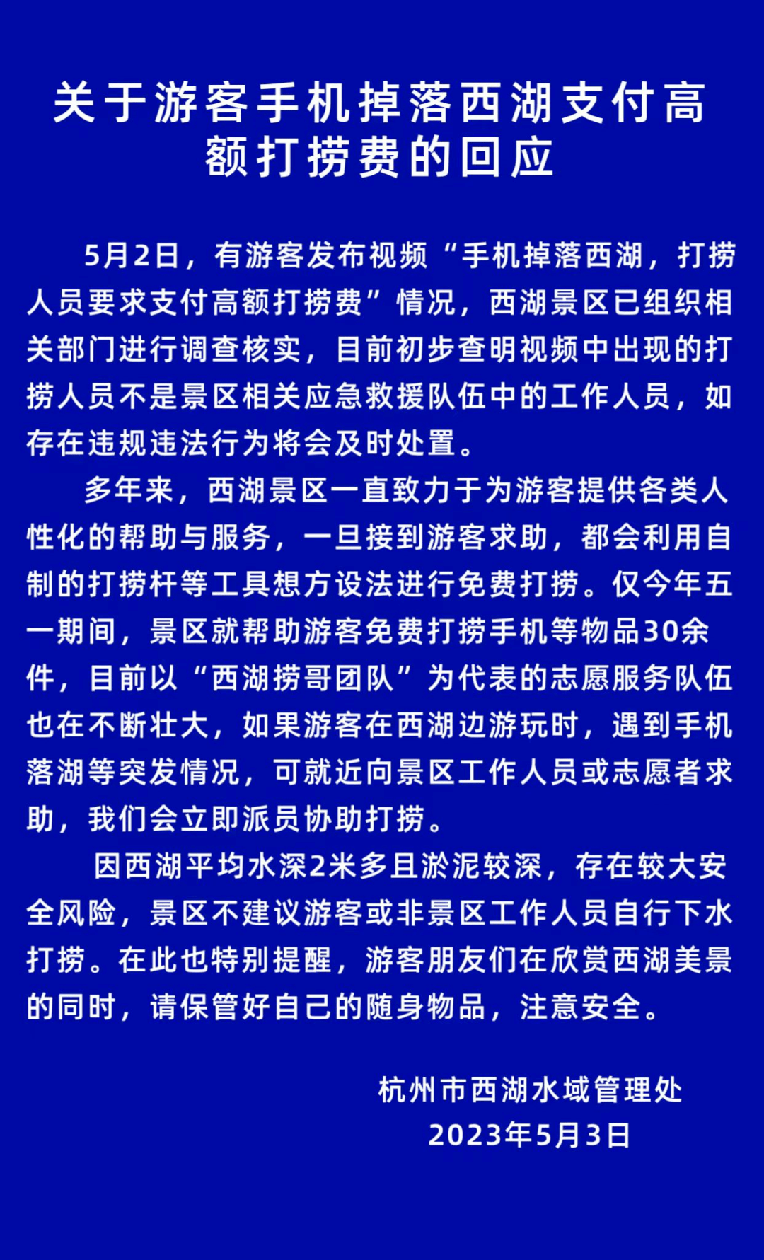 同时回应提到,多年来,西湖景区一直致力于为游客提供各类人性化的帮助与服务,一旦接到游客求助, 都会利用自制的打捞杆等工具想方设法进行免费打捞,仅今年五一期间,景区就帮助游客免费打捞手机等物品30余件,目前以“西湖捞哥团队”为代表的志愿服务队伍也在不断壮大,如果游客在西湖边游玩时,遇到手机落湖等突发情况,可就近向景区工作人员或志愿者求助,我们会立即派员协助打捞。