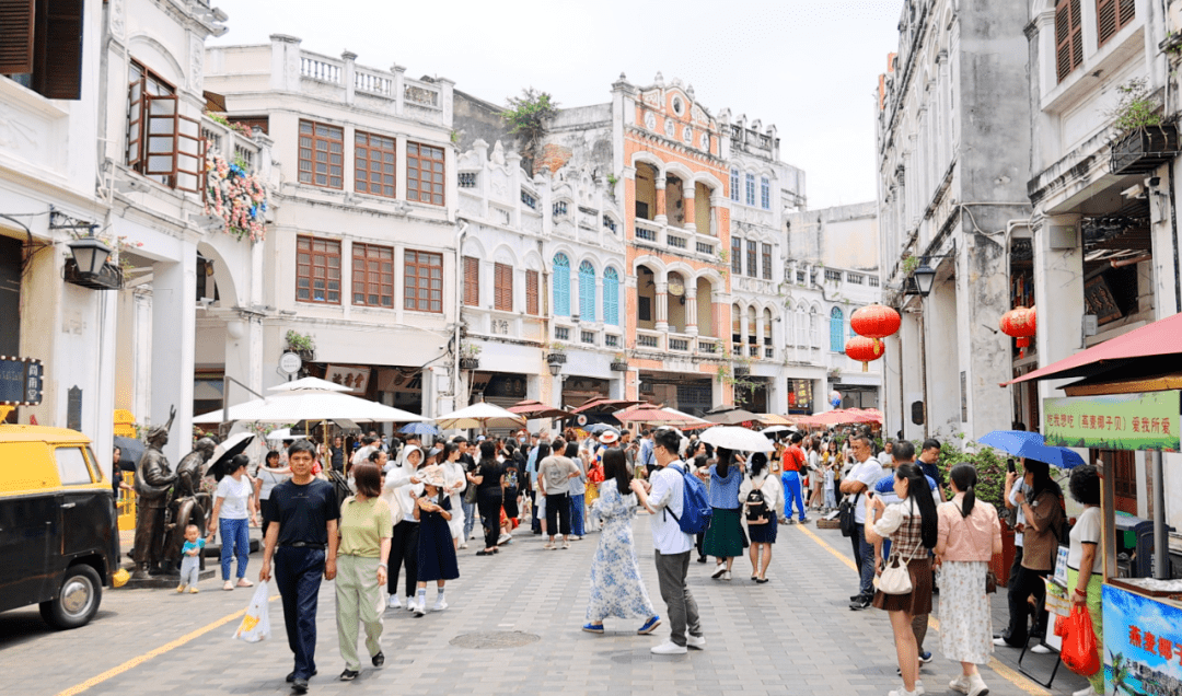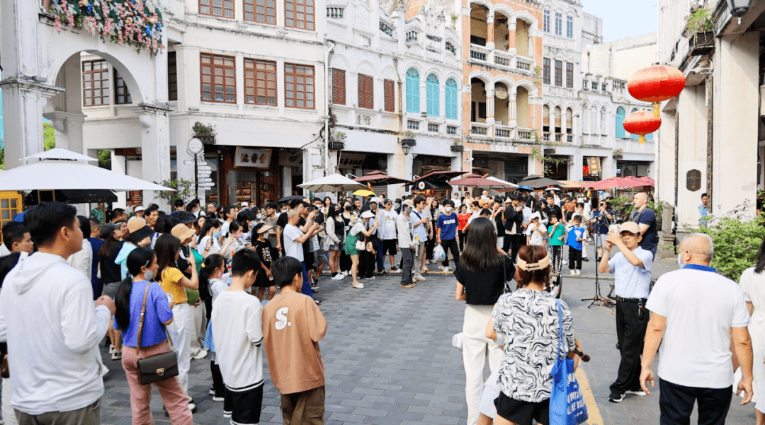 海口骑楼老街观光客流持续高位运行,两天时间,景区接待客流达83491人次。街头艺人评选赛暨惠民展演、琼剧非遗文化戏院公益惠民演出、龙华非遗文创展、街艺快闪……“五一”期间,骑楼老街每日都推出丰富的旅文活动。在“畅享‘五一’·一起嗨”街头艺人评选赛暨惠民展演活动中,各路音乐爱好者汇聚一堂,同台竞技,用自己的技艺争取名额不多的海口湾街头艺人名额。
