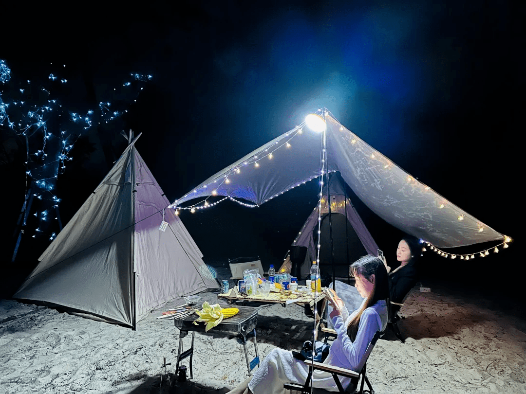 15:00左右惠东碧海湾海边轻奢露营地,海湾位于在双月湾和巽寮湾中间地带,至今仍末开发的原始沙滩,沙滩旁边绿树成阴,林木茂盛,有热带、亚热带植物,高大茂密的大树遍野,为我们提供了躲阳的好去处。