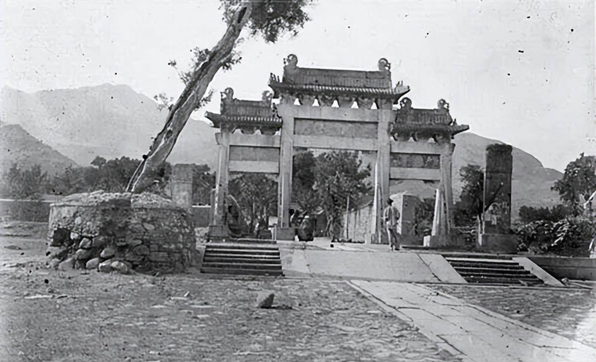 1907年,泰山岱宗坊。有一棵大树快要倒了,就像比萨斜塔一样。