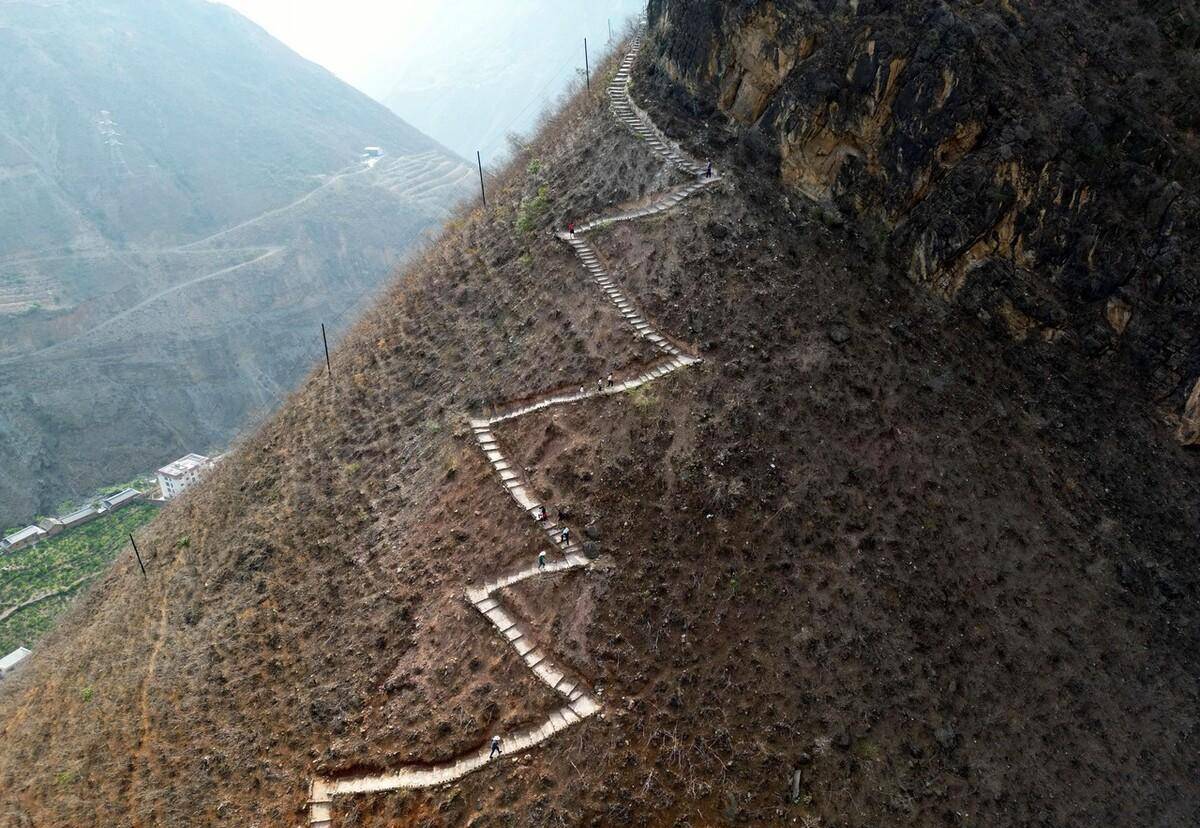 四川凉山彝族自治州昭觉县支尔莫乡阿土勒尔村,是名副其实的"悬崖村",72户人家居住在这里,这个村处于美姑河大峡谷断坎岩肩斜台地,所在位置就像三层台阶的中间那级,海拔1400多米,与地面垂直距离约800米。村里通向外界,需要顺着悬崖断续攀爬17条藤梯,其中接近村庄的几乎垂直的两条相连的藤梯长度约100米,陡直的崖壁通过时非常危险。