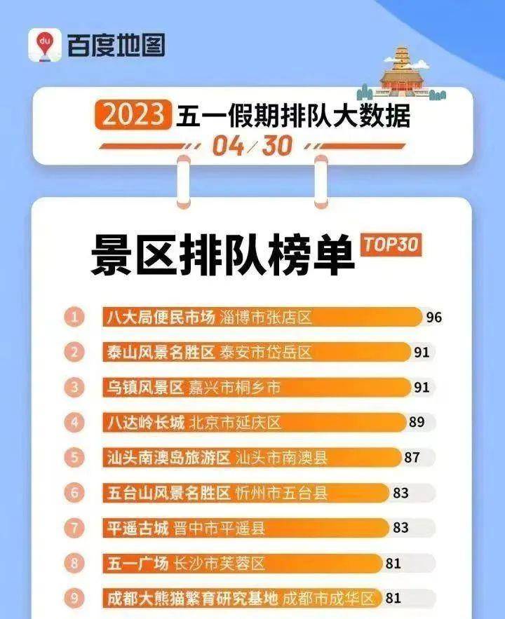 在百度地图的2023五一假期景区排队TOP30榜单上,乌镇景区名列第三,仅次于淄博和泰山。