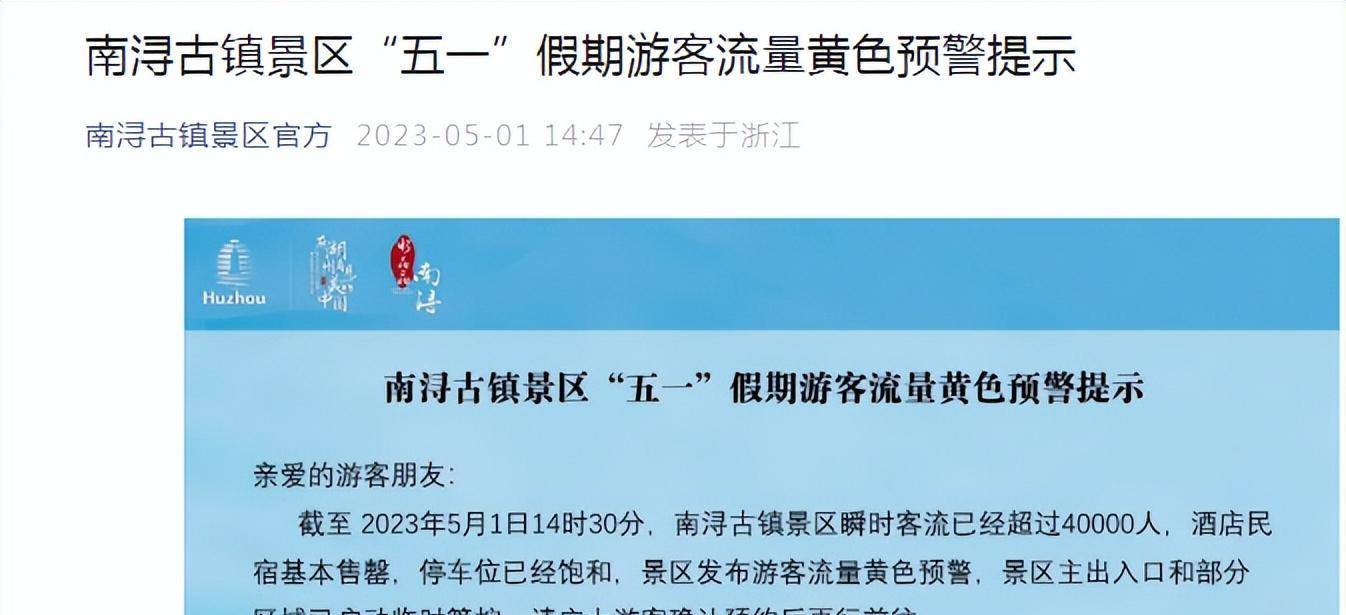 与乌镇直线距离相隔16.28公里的南浔古镇,5月1日景区瞬时客流超4万人,已经超过接待负荷,不得不发布黄色预警,景区主要出入口和部分区域启动临时管控。