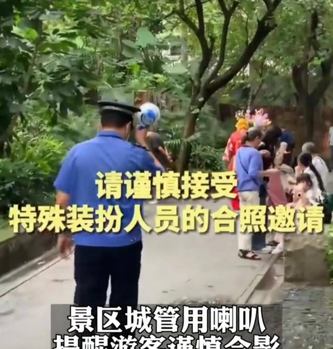 这是一位好城管,担心再有其他的人上当,便用大喇叭提醒游客,谨慎合照。