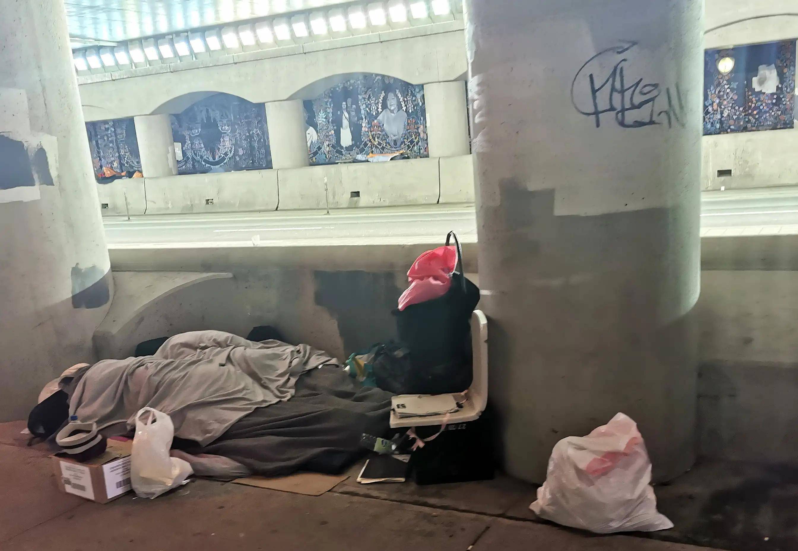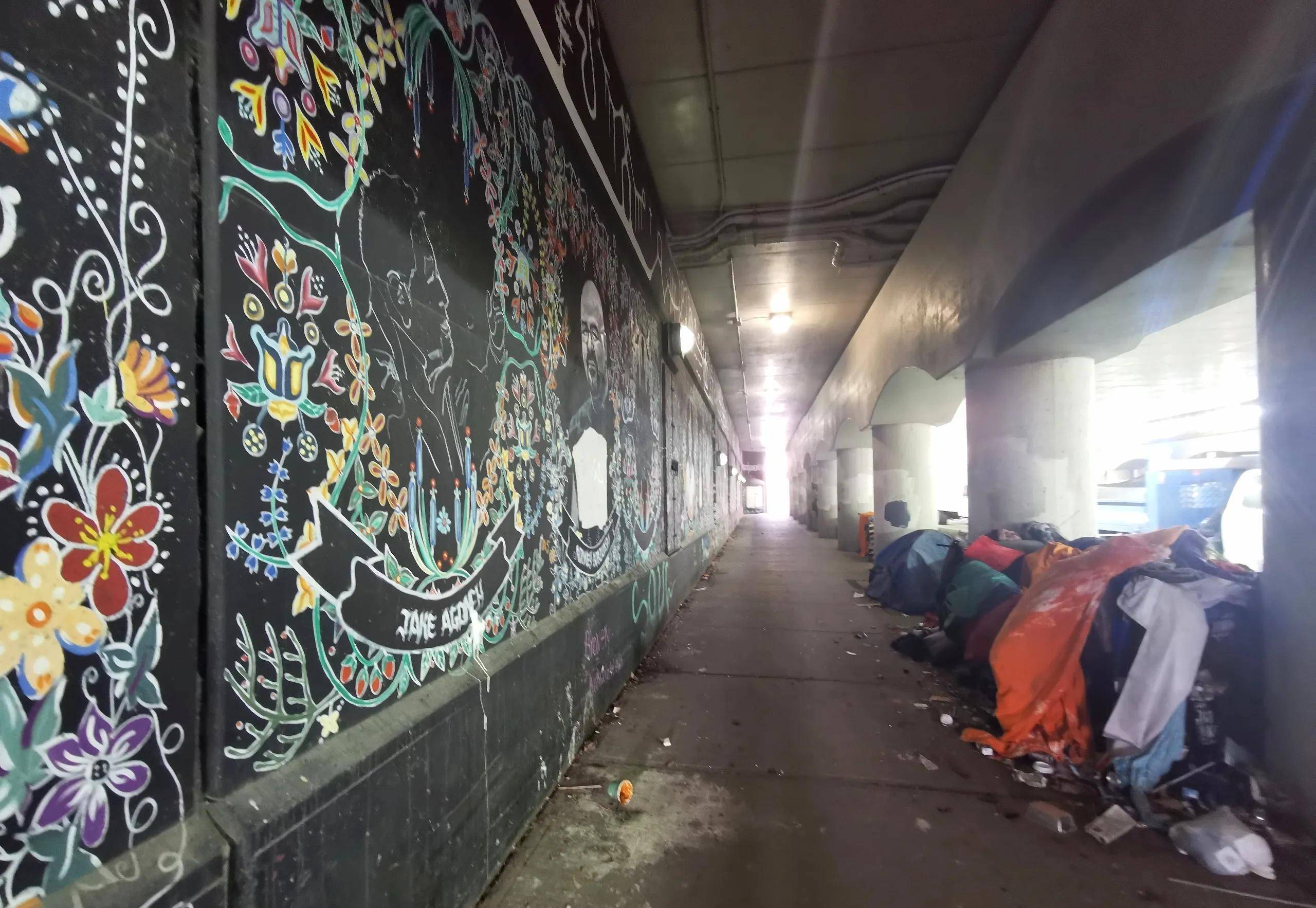 入地下通道我就后悔了,一股浓郁的尿演技味差点没把我憋过气去。只见靠近中部的桥柱之间有两个无家可归者的据点,一个占地较小,只有一顶小帐篷;另一个把两根柱子间的空地全占满了,各种颜色的衣服布料堆得高高的,地上到处都是垃圾,散发出难闻的气味 。可能是白天的缘故,两个据点里都没有人。我掩鼻匆匆走过,离开老远才又回头看了一眼墙上的壁画,空缺的那两位印第安长者肖像已经补上了。