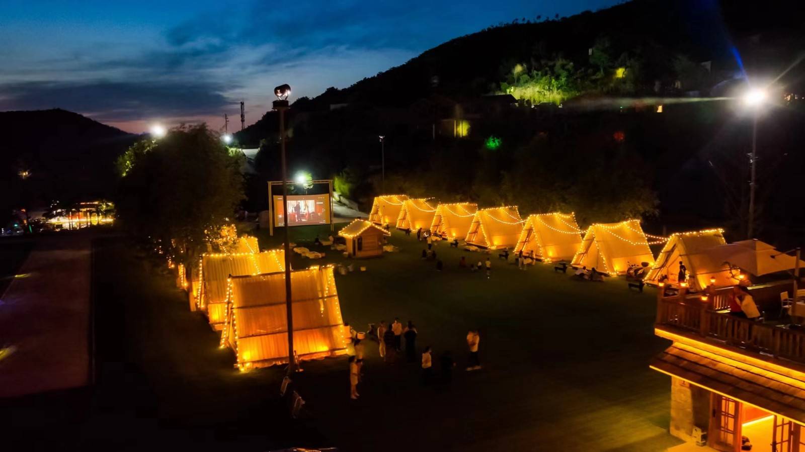 当月亮爬上树梢,繁星点缀山间,坐在帐篷前的草坪上,看一场露天电影,在山野间抚慰疲惫的身心