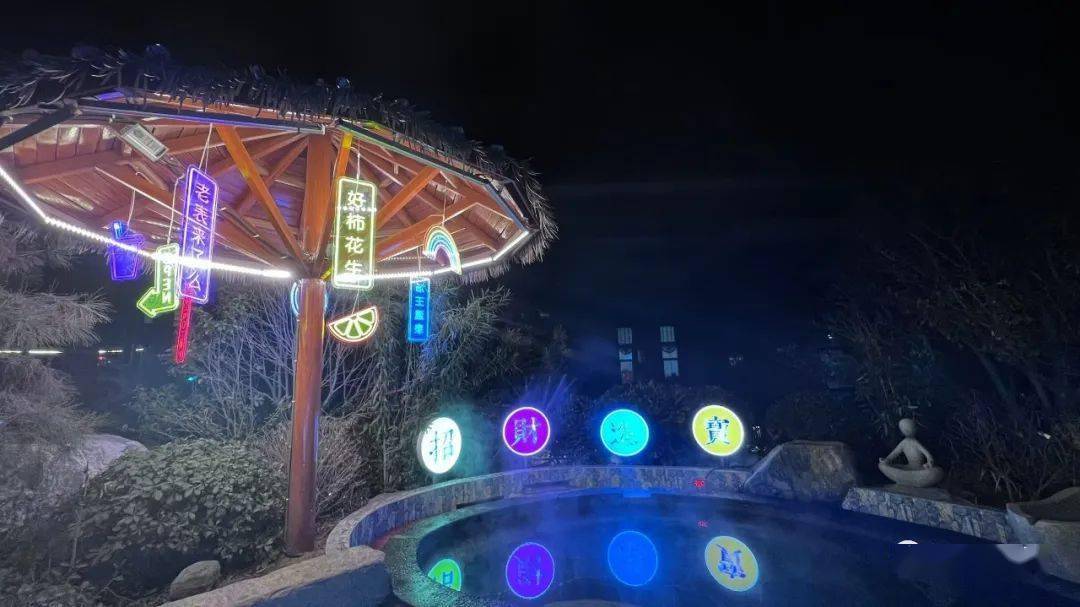夜幕下的汤王温泉,在灯光的衬托下,色彩斑斓,营造出一种浪漫温馨的氛围。 夜宿温泉树屋、汤苑民宿,享尽康养体验。