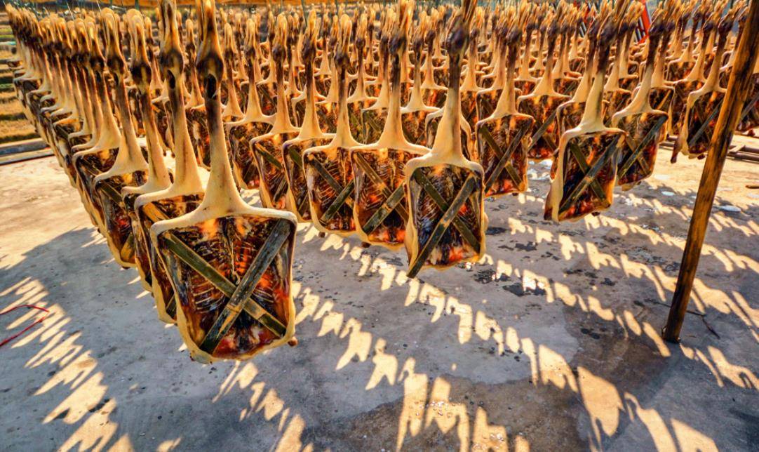 大田建设镇海拔较高,进入寒冬后,干燥的霜风让鸭子在特定的风力、温度、湿度的作用下,形成了独特腊味。作为一种有着数百年之久的传统地方美食,建设腊鸭的制作过程严格遵守着气候、选材、工艺等方面的约束。