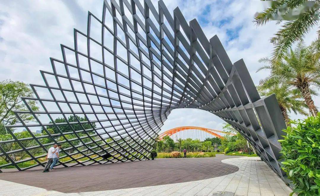 除了留存“城市记忆片段”景观,这里还打造了一系列现代艺术风格新景致。佛山新港码头最西侧位置,创新打造了 一个长15米、宽16米、高12米的大型3D扭曲钢结构渔网雕望,设计象征着码头文化、渔村文化有机融合,渔网钢铁雕望的每个角度都会呈现不一样的视觉效果。