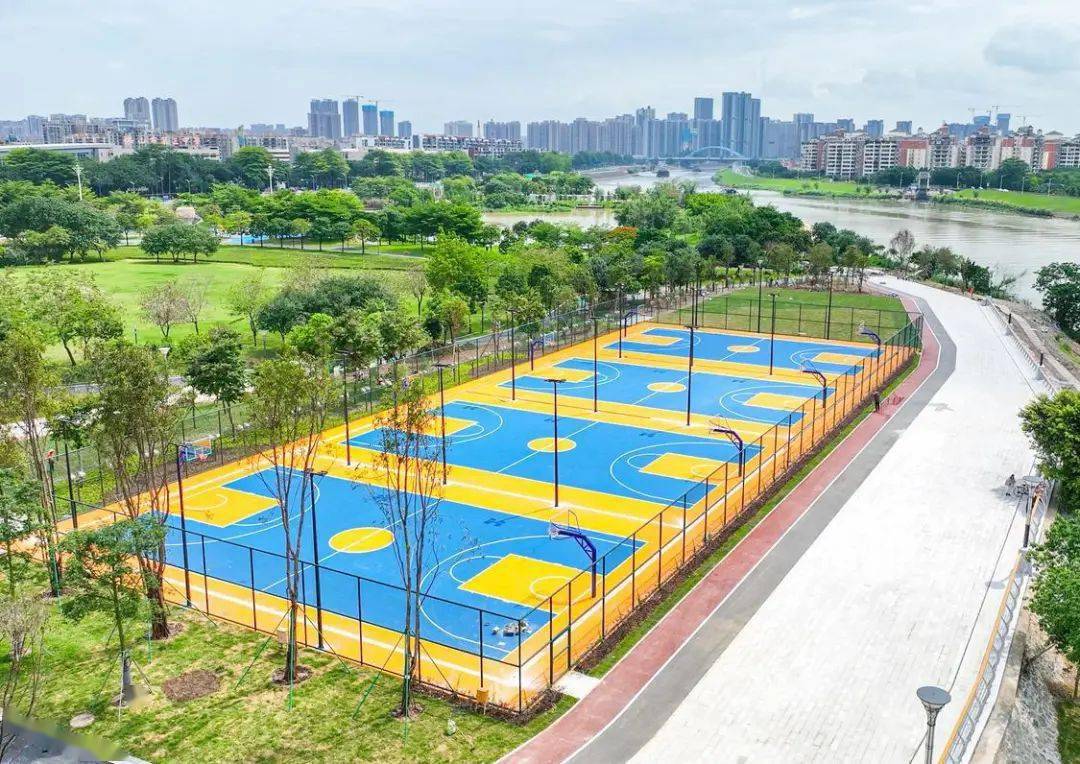 篮球场也是年轻人喜爱的运动场地之一。活力新港公园篮球场采用丙烯酸防滑面层, 配备4个标准篮球场(8个篮框),总面积为2843㎡,最多可同时容纳近百人。放松时间,三五成群的年轻人可相约来到篮球公园,跨步、上篮,在场上挥洒汗水。