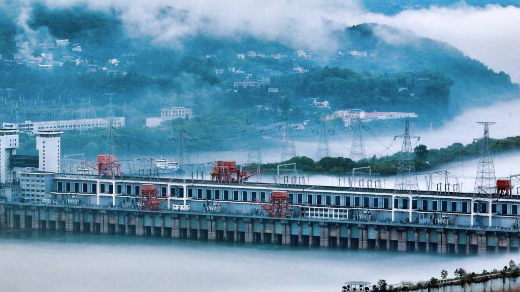 长江葛洲坝水利枢纽工程在薄雾的笼罩下,更显气势磅礴,雄伟壮观。王建锋/视觉中国