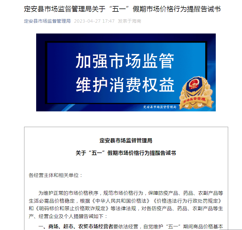 为确保“五一”期间市场安全稳定,定安县市场监管局认真贯彻落实县委、县政府和省局工作要求,高度重视、精心谋划,立足监管职能,突出工作重点,细化监管措施,强化假日市场监管工作,切实维护“五一”节日期间市场秩序。