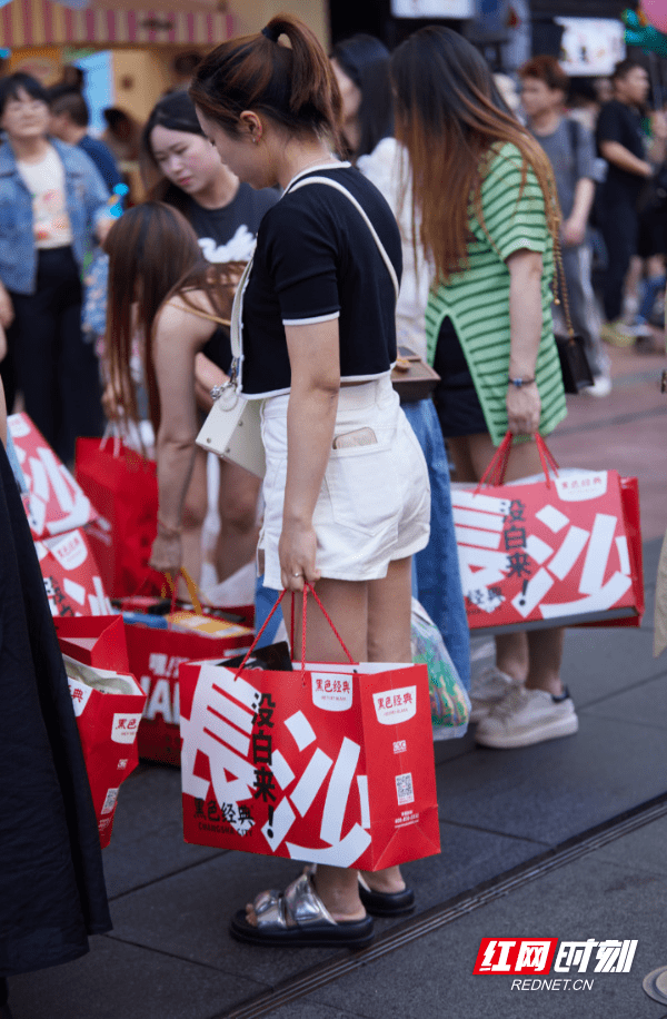 在黄兴路步行街,还可以看到有不少游客拿着黑色经典臭豆腐和“长沙没白来”礼袋在拍照打卡,“来长沙必定要吃臭豆腐,我得拍个照片发个圈。”来自江苏的游客胡女士笑着说。