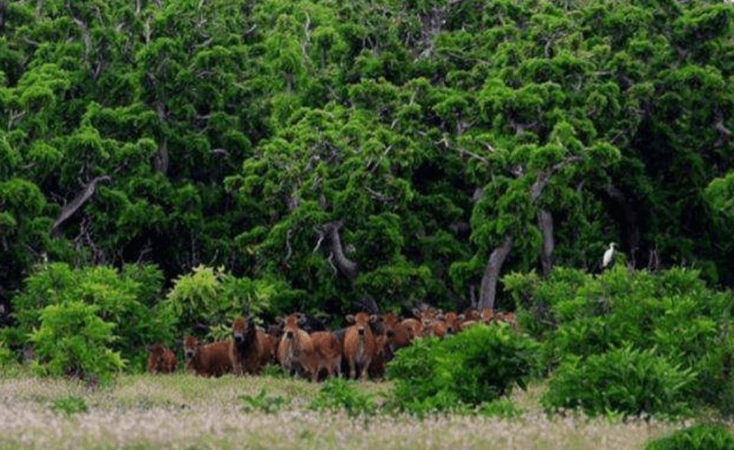 西沙东岛面积较甘泉岛大得多,岛上的树木更为繁茂,全岛遍布麻枫桐、草海桐及银毛树等原生树种构成的密林,还有大量椰子树、木麻黄等人工林,空中鸟瞰犹如一块绿色的翡翠,煞是漂亮,由于林木繁茂,岛上还繁衍着数百头野牛。