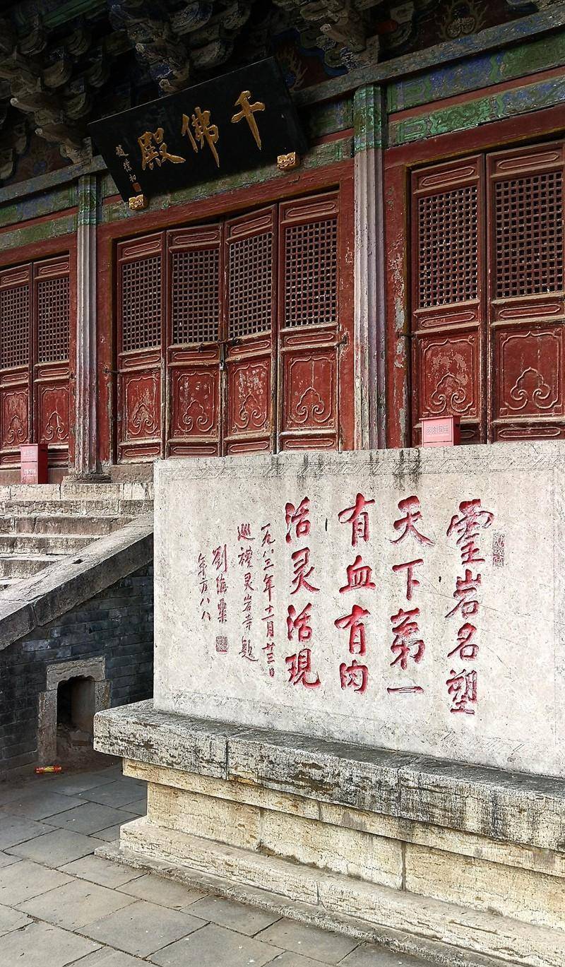 千佛殿位于摩顶松北,建于唐,拓于宋,重修于明清,规模宏伟,金碧辉煌,是灵岩寺中保持完好、规模最宏大的主体建筑物。大殿建于踏步11级、高约2米的石基之上,殿面阔7间,进深4间,单檐庑殿顶,上盖灰简瓦和绿琉璃瓦,单檐庑殿顶,上盖灰简瓦和绿琉璃瓦,檐下多棱石柱,彩绘斗拱,檐下出“铺作”斗拱3跳,使该殿出挑疏朗宏大。前檐8根石柱,雕刻精丽华美,刻有龙、凤、花、叶、水波及莲瓣、宝装荷花等纹样。该殿虽经历代重修,有些已非原物,但它仍保存着唐宋的风格。