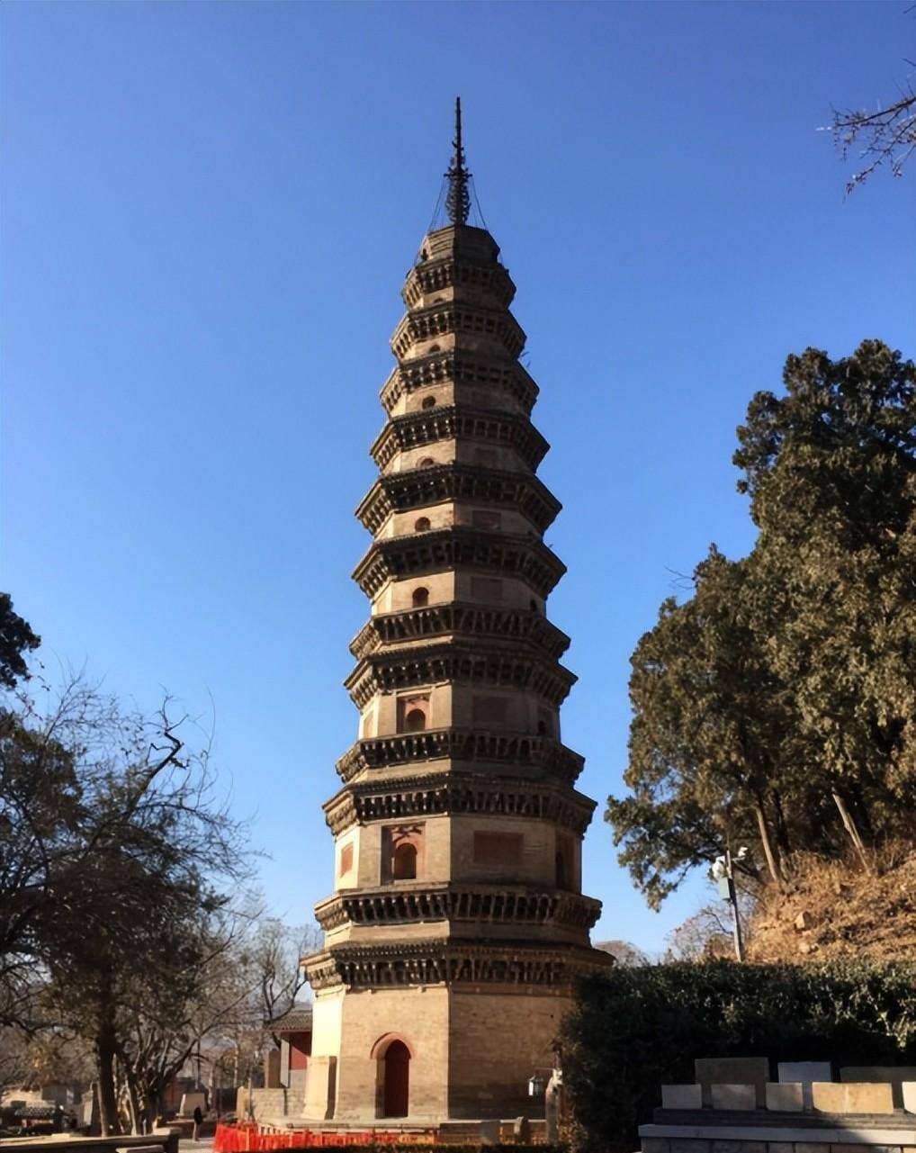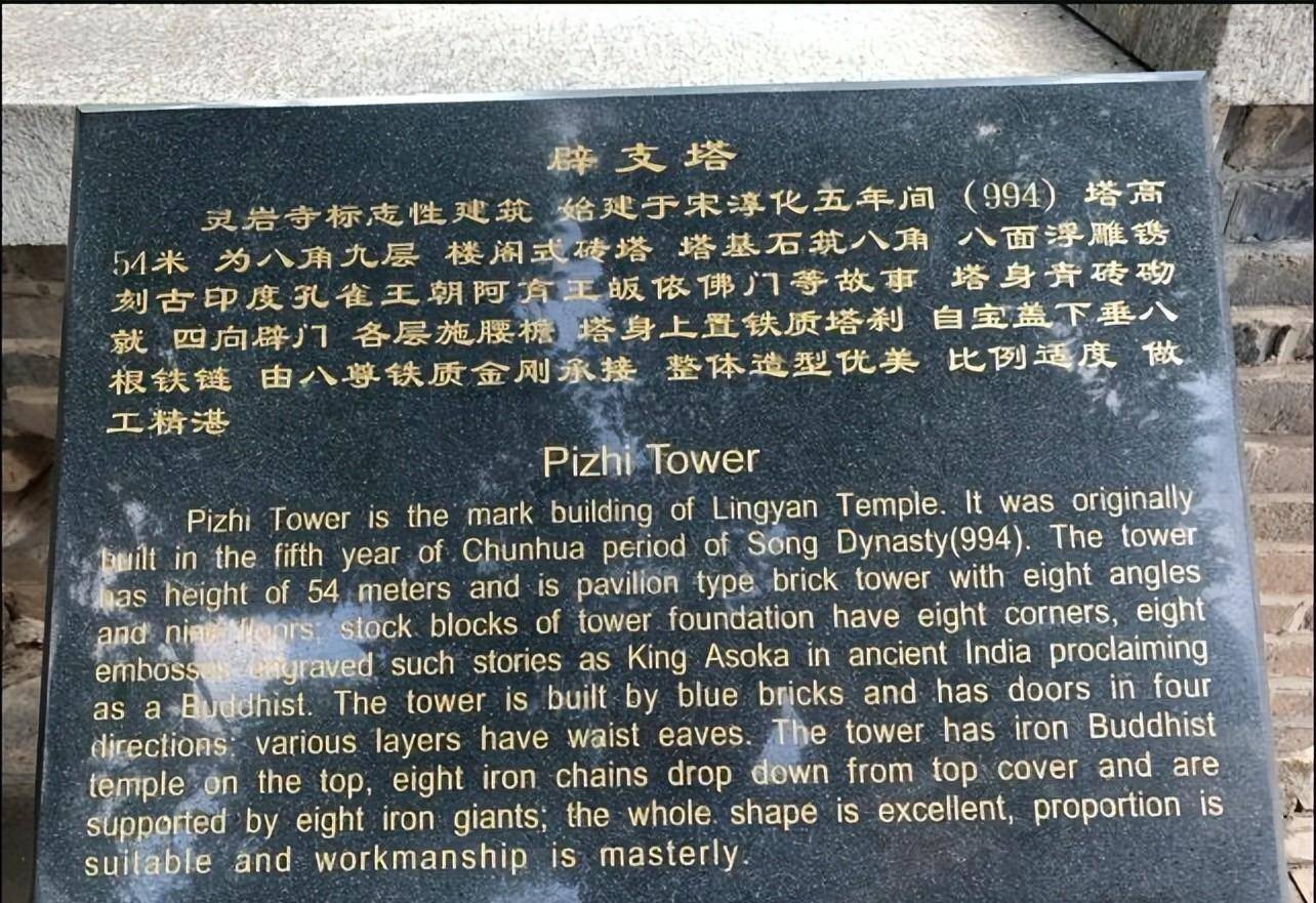 参观完千佛殿后,绕道寺后的西北面可欣赏辟支塔。辟支塔,以辟支佛命名,耸立在千佛殿西北百米处,是灵岩寺的标志性建筑,建于唐天宝十二年(公元753年),宋淳代五年(公元994)年重建,是一座8角9层12檐的楼阁式建筑。塔高54米,底固长48米,为砖砌,可循级而上,下三层为重檐,上六层为单檐。通体呈灰白色,基座石砌,塔身为青砖砌筑,东西南北四面设门,底部3层为重檐,余皆单檐。塔檐由华拱两跳组成,朵数逐层变化,塔层高度与塔径自下而上逐层递减,收分得体,挺拔雄伟。塔基周围有40余组浮雕,讲的是古国外孔雀王朝阿育王皈依佛门的故事。