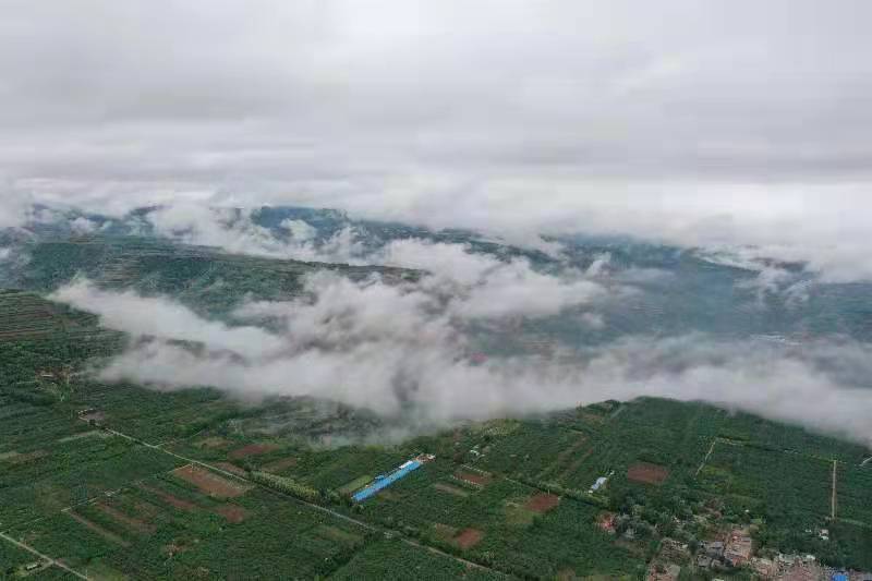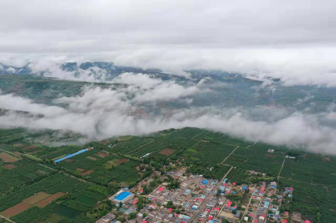 5月4日,一场夜雨过后,乳白色的水蒸气从大山中冉冉升起来,快速形成云雾,弥漫在陕州塬上西张村镇的上空,有时像白色纱幔笼罩在大地上空,有时像白色绒帽戴在山顶上,有时像白龙盘踞在山脊。云海时浓时淡,变幻莫测,宛如仙境,美不胜收。