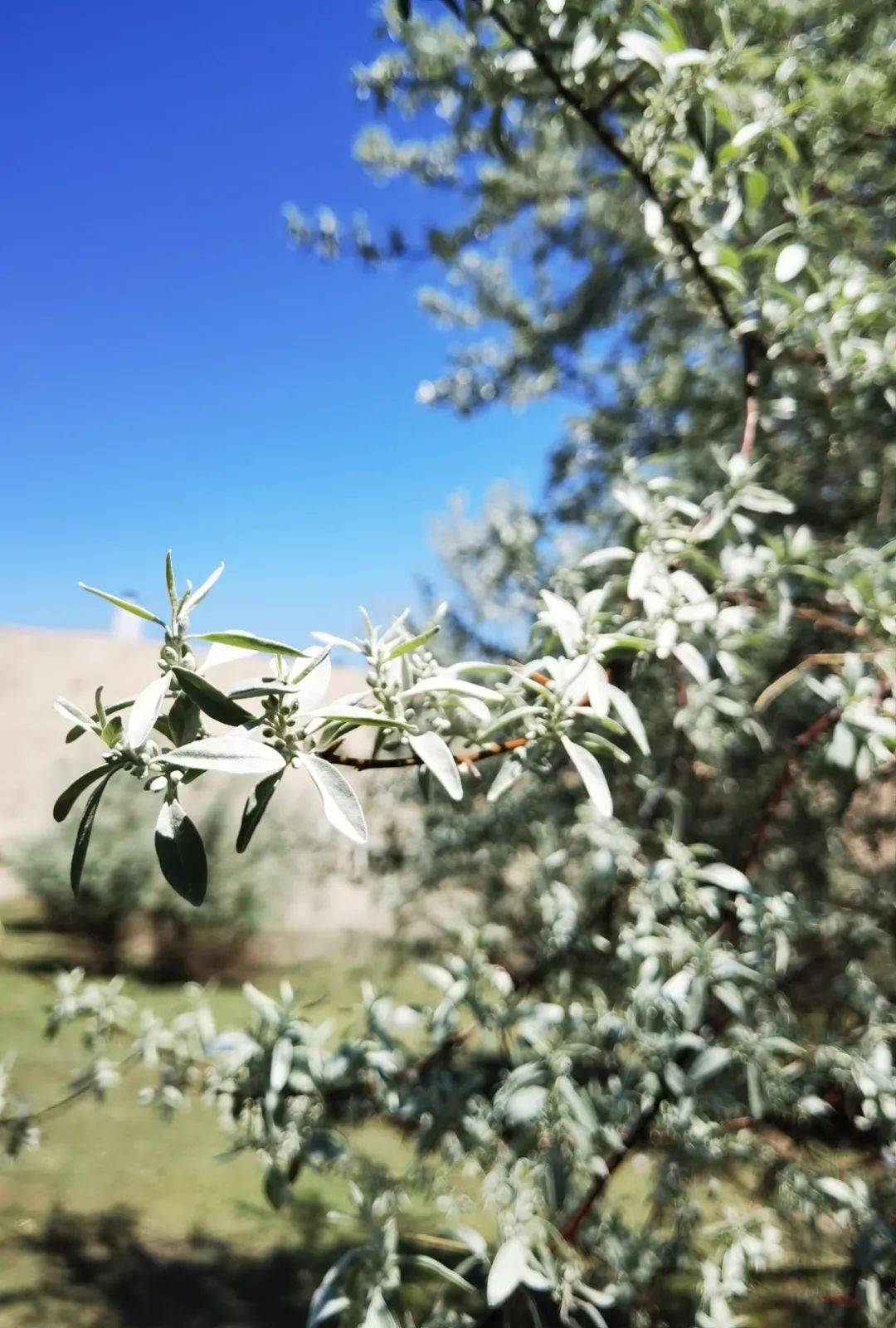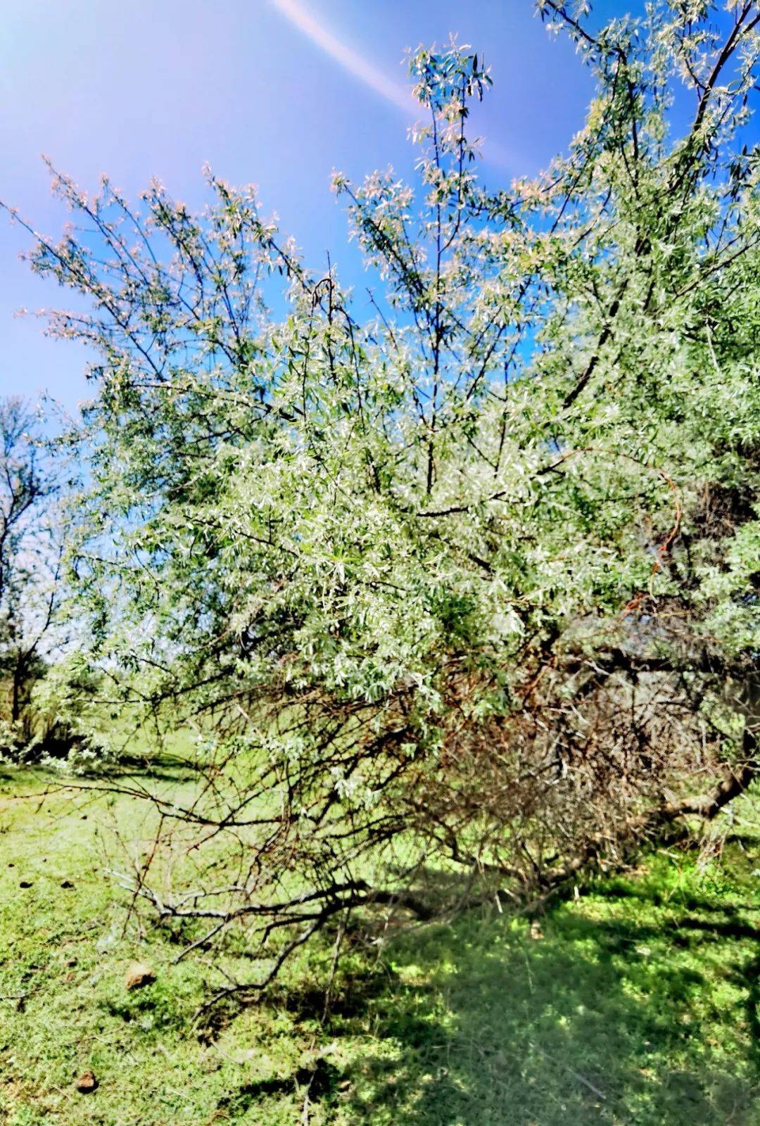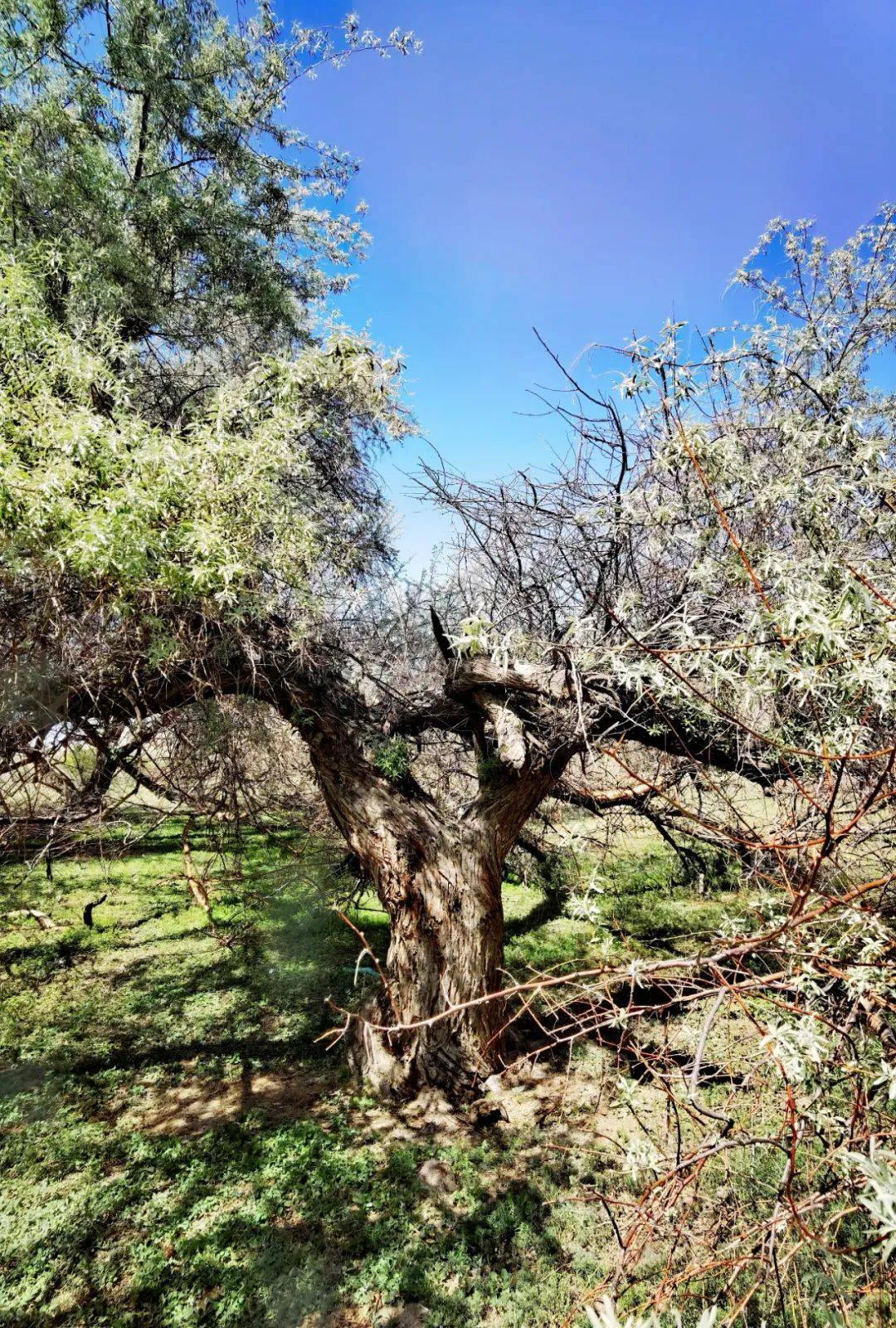霍城县伊犁河国家湿地公园里有一片沙枣林,这地方离图开沙漠不远。5月初的河谷气温比较低,沙枣花含苞待放。沙枣树春天发芽晚、长叶迟,沙枣花盛开时小黄花呈喇叭状,却吹出了无风香弥漫,顺风香幽远情形,即便是离树很远,依然香气扑鼻。
