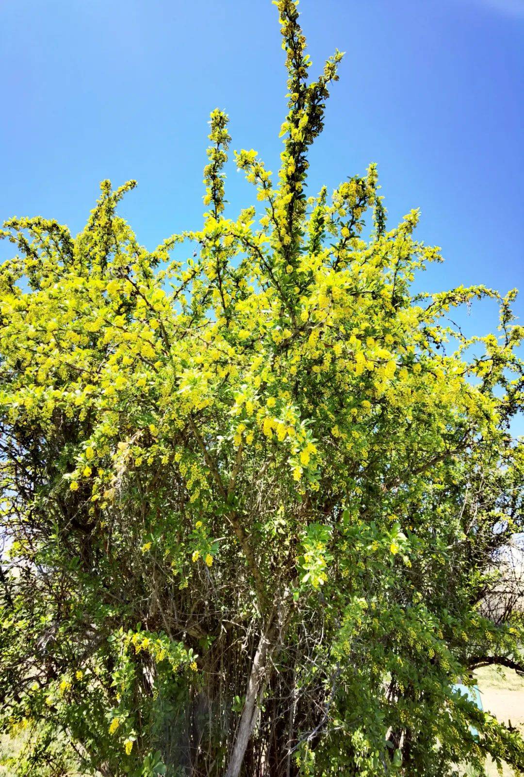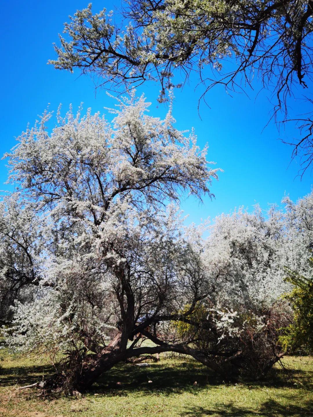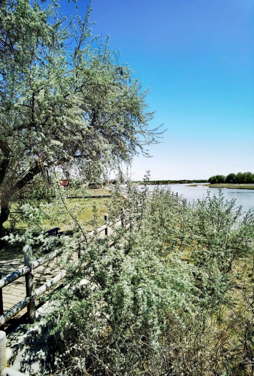 霍城县伊犁河国家湿地公园里有一片沙枣林,这地方离图开沙漠不远。5月初的河谷气温比较低,沙枣花含苞待放。沙枣树春天发芽晚、长叶迟,沙枣花盛开时小黄花呈喇叭状,却吹出了无风香弥漫,顺风香幽远情形,即便是离树很远,依然香气扑鼻。