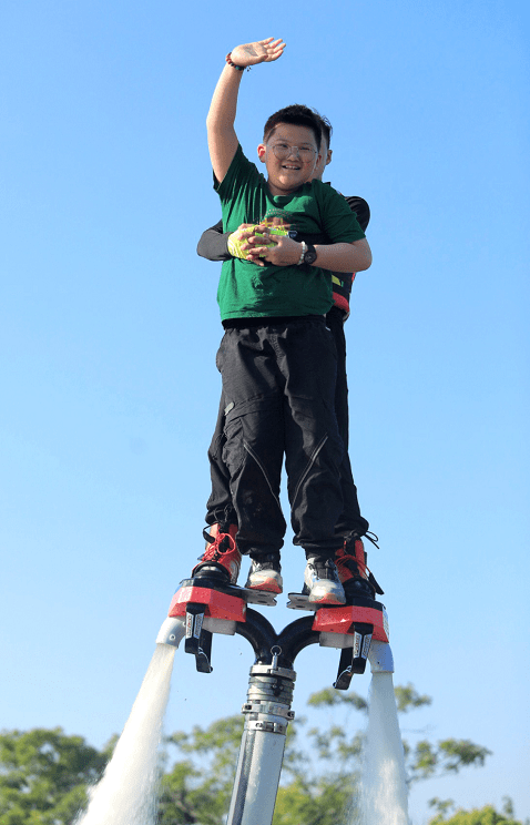 拱桥、戏台、水街、舟楫等江南水乡符号以写意化的现代风格再现,与整体通透的亮空间、淡淡的绿蓝色展墙融为一体,在这“水光月色两相兼”的诗意空间,水上飞人带着一道璀璨的星光划破黑夜,为游客展现了一场精彩绝伦的视觉盛宴。