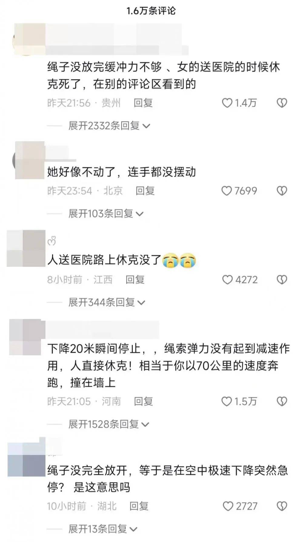 这则视频引发了很多网友的关注,5月4日晚,网上突然出现了“该游客已经去世”的消息:“绳子没放完缓冲力不够,当时就休克了,送往医院的路上去世了”“相当于以70公里的速度奔跑撞在墙上,人直接没了”……