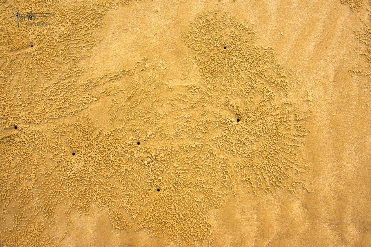 理论上:“沙蟹是温海潮间带和潮上带生活的优势蟹类,穴居沙滩较深的洞中,洞一般呈螺旋形,洞口形成沙塔,为沙蟹所特有。雌蟹的洞高如沙塔,可能内藏雄蟹……”但事实胜于雄辩,这里却很少有“沙塔”的存在,也或许是平潭岛上海风肆虐的缘故吧,使得沙蟹们辛辛苦苦从洞里“刨”出来的沙球,刚“叠”起来就被吹成了菊花一般放射状的模样。
