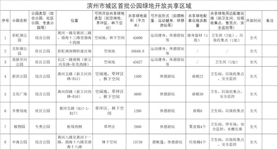 本次开放城市公园8处,包括彩虹湖公园、太阳湖公园、南新开河公园、新滨公园、文化广场、齐鲁绿地、滨州植物园、中海公园(具体信息见附件)。