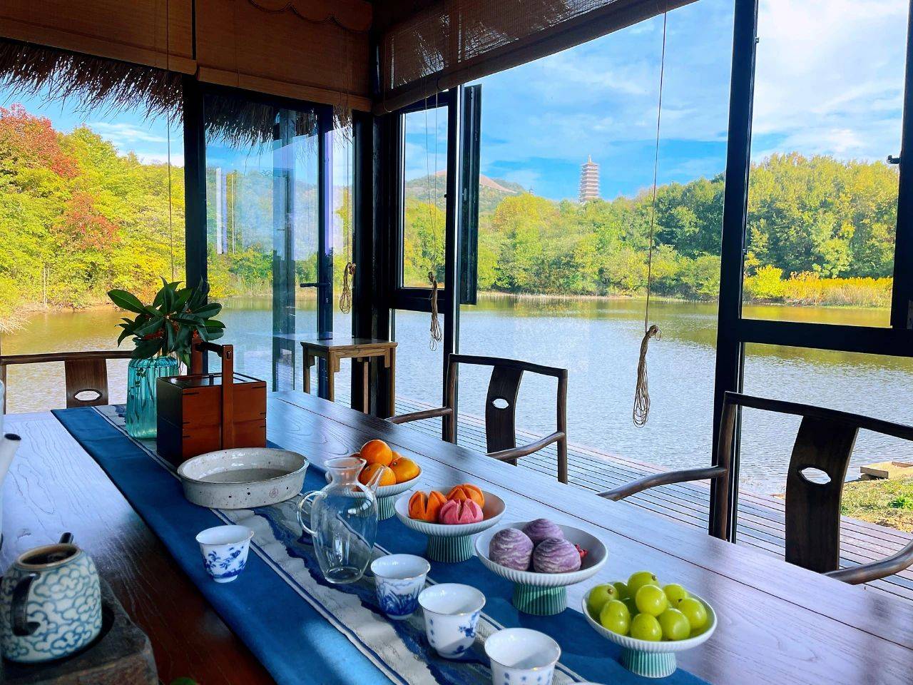亭内摆放着泡茶器具,果盘和茶点也很精致,四周是镂空窗棂,透过窗棂向外望去,山水皆入眼帘,还有两只天鹅在畅游。看着湖水波光粼粼,听着鸟儿啁啾,置身其中,人们会不由自主地放慢自己的步伐,感受着这里所散发出来的宁静和舒适。