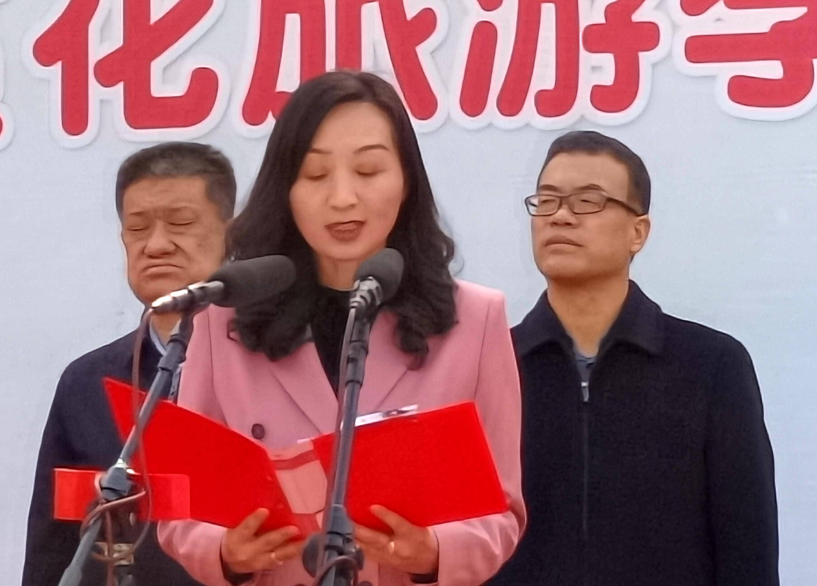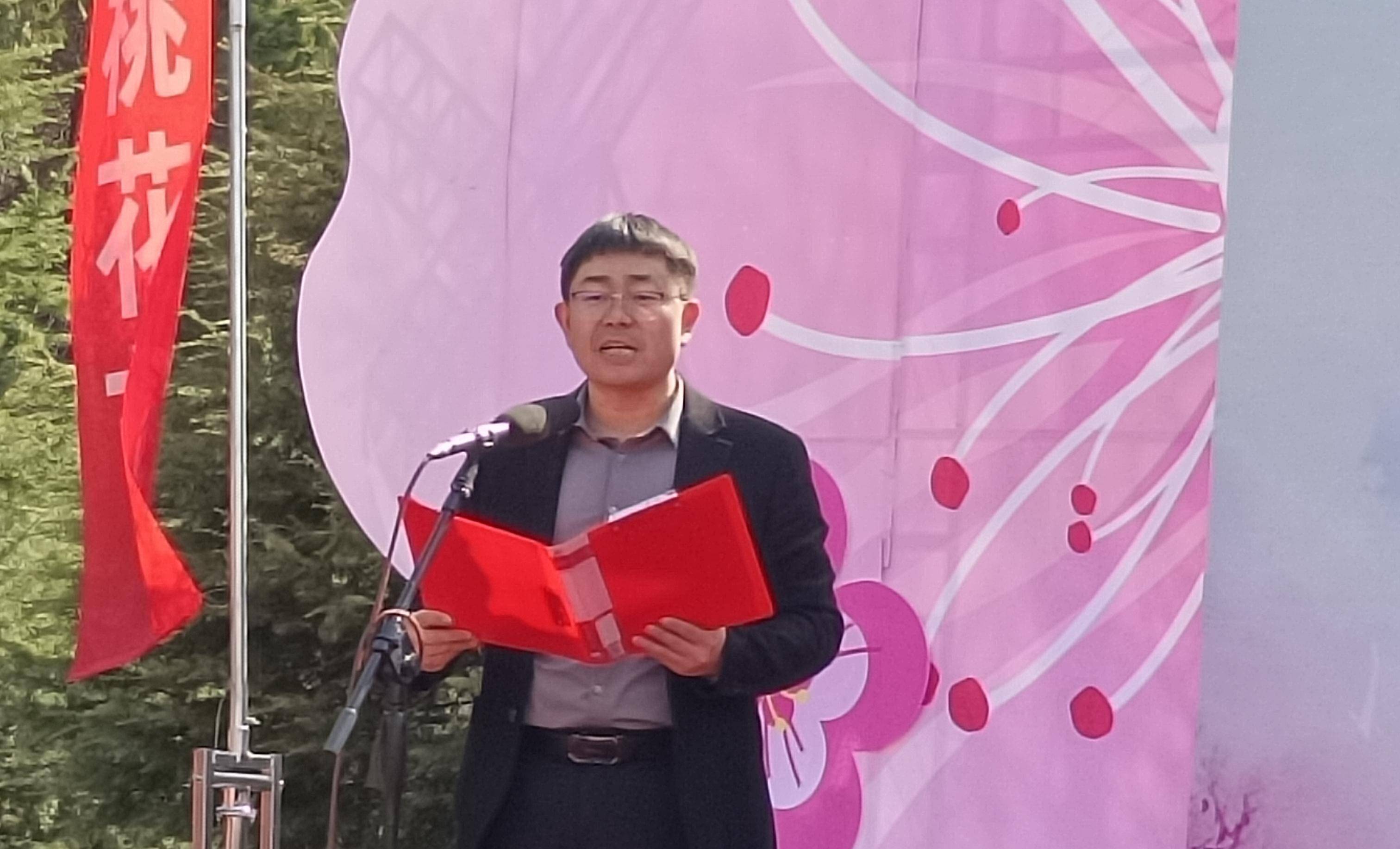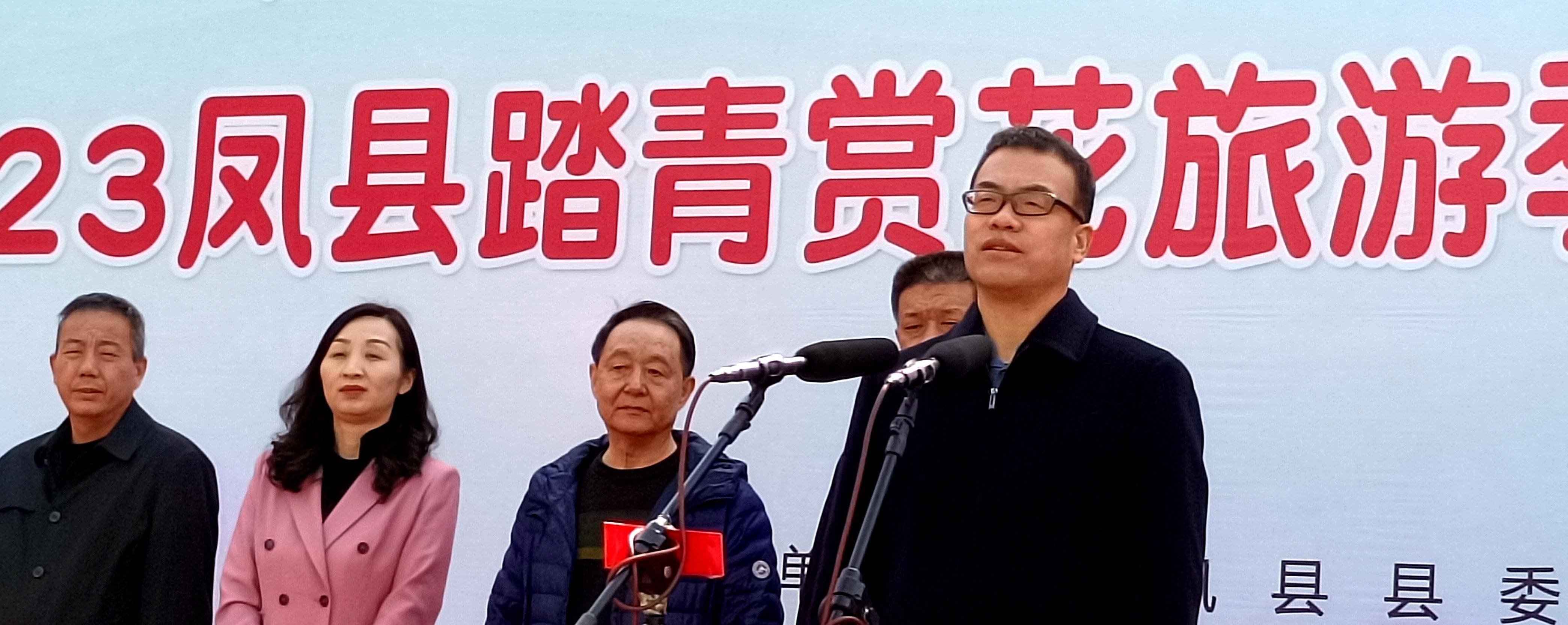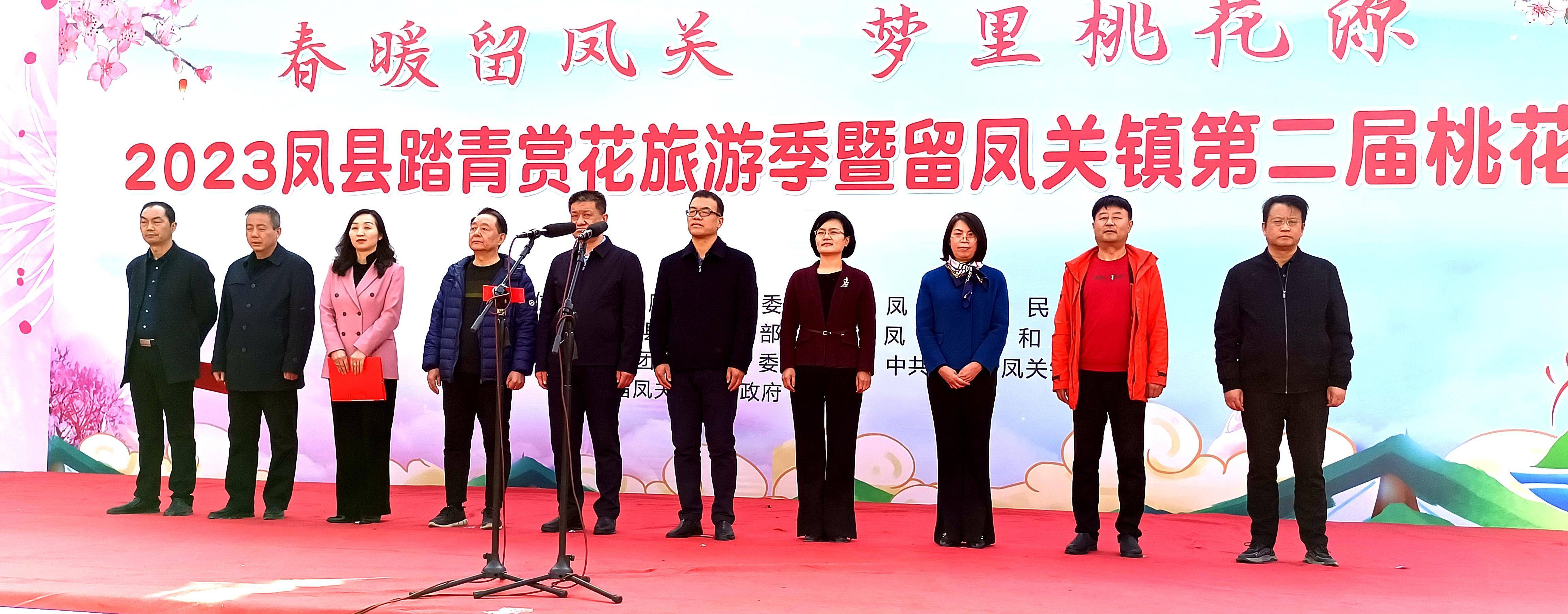 凤县县委副领导严立章宣布2023年凤县踏青赏花旅游季暨留凤关镇第二届桃花节开幕。