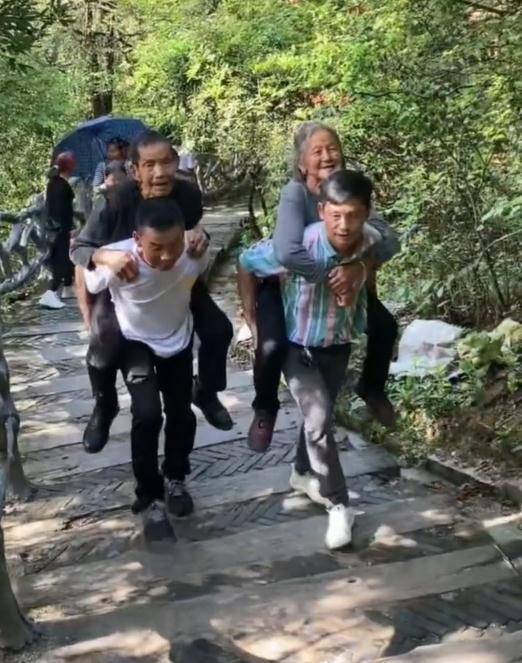 4月30日,五一小长假期间,湖南怀化的陈楚福姐弟三人带着家人一起出游,爬山时半路上已经80多岁的父母走不动,陈楚福和哥哥陈楚涛一起将父母背上了山顶。这一幕被同行的游客拍摄下来,陈楚福分享在自己的社交平台上感动了很多网友。