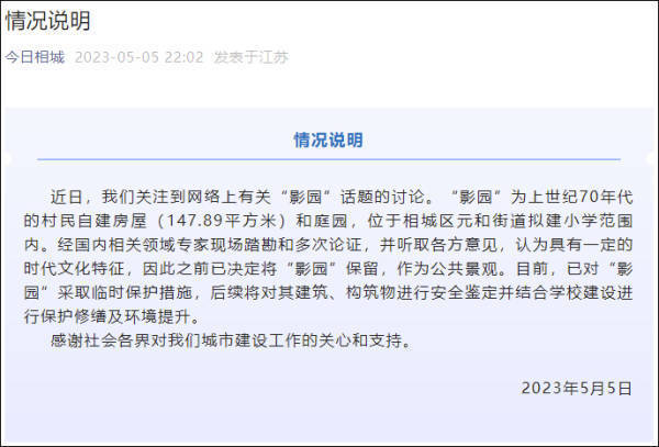 苏州相城区委宣传部微信公众号“今日相城”5月5日发布情况说明称,近日,关注到网络上有关“影园”话题的讨论。“影园”为上世纪70年代的村民自建房屋(147.89平方米)和庭园,位于相城区元和街道拟建小学范围内。经国内相关领域专家现场踏勘和多次论证,并听取各方意见,认为具有一定的时代文化特征,因此之前已决定将“影园”保留,作为公共景观。目前,已对“影园”采取临时保护措施,后续将对其建筑、构筑物进行安全鉴定并结合学校建设进行保护修缮及环境提升。