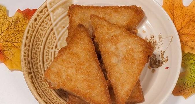 福州的芋粿也可以叫三角糕,它是用芋头切丝混以米浆或面粉搅拌,直接蒸好切块再油炸的一种食品,经常是一碗锅边配一块三角糕,那滋味,反正是能令我回味无穷。那些年还在福州工作的时候,我父亲来看我,就会吵着说要吃三角糕,每次都让我到南街那家老福州的外卖窗口给他买,确实,他对吃的要求这么高的人,那家的三角糕也是我吃过的口感最好的一家,里面会加一些绿豆粉,也算是创新了,口感是黏糯,但不粘牙。