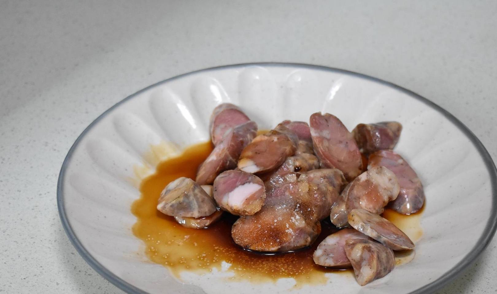 第四步在煮米饭时,把腊肠切片,用料酒、生抽和砂糖拌匀腌制片刻。