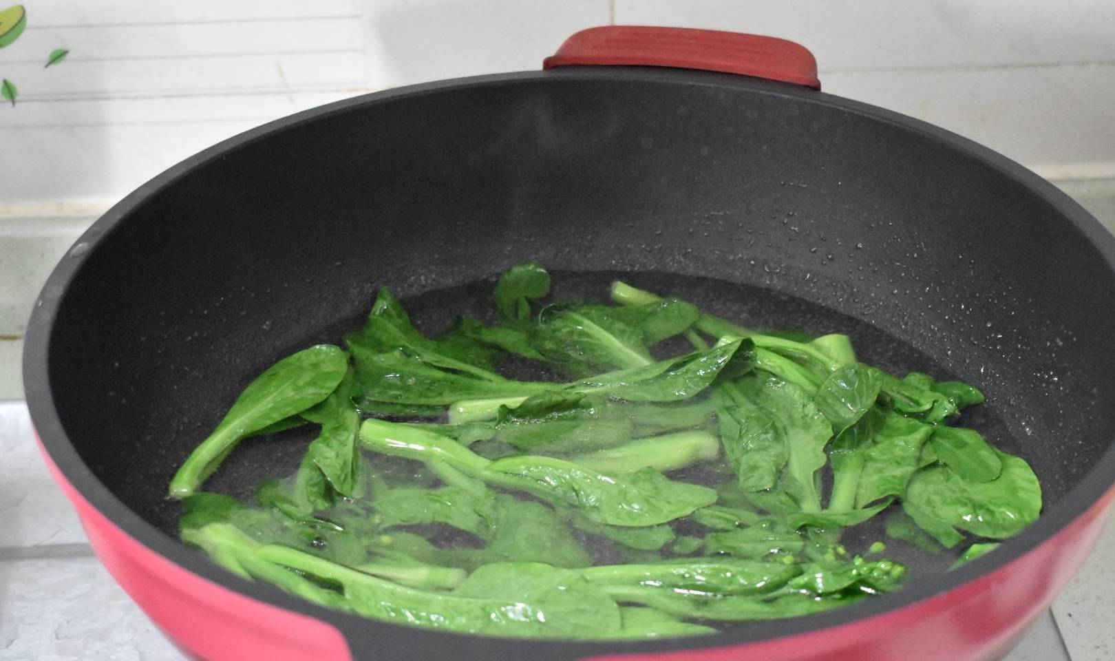 第七步用煮锅烧开水,放入清洗干净的菜心,菜心焯水。