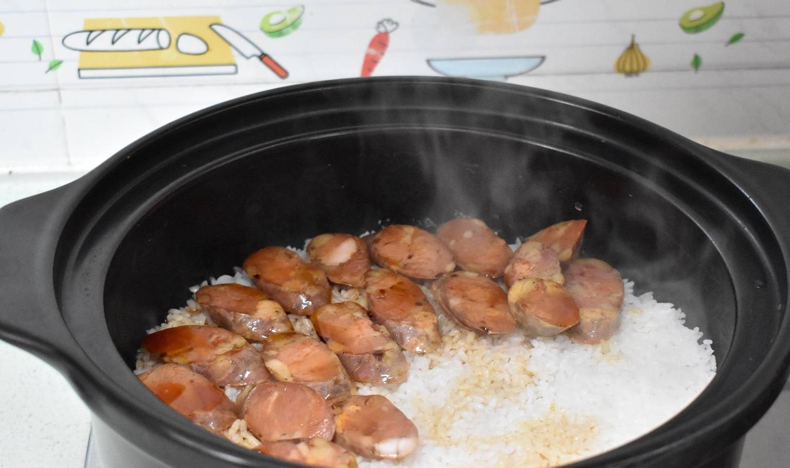 第三腊肠在大米表面比较干就要放入,那样可以使得腊肠和米饭在差不多时间煮熟。