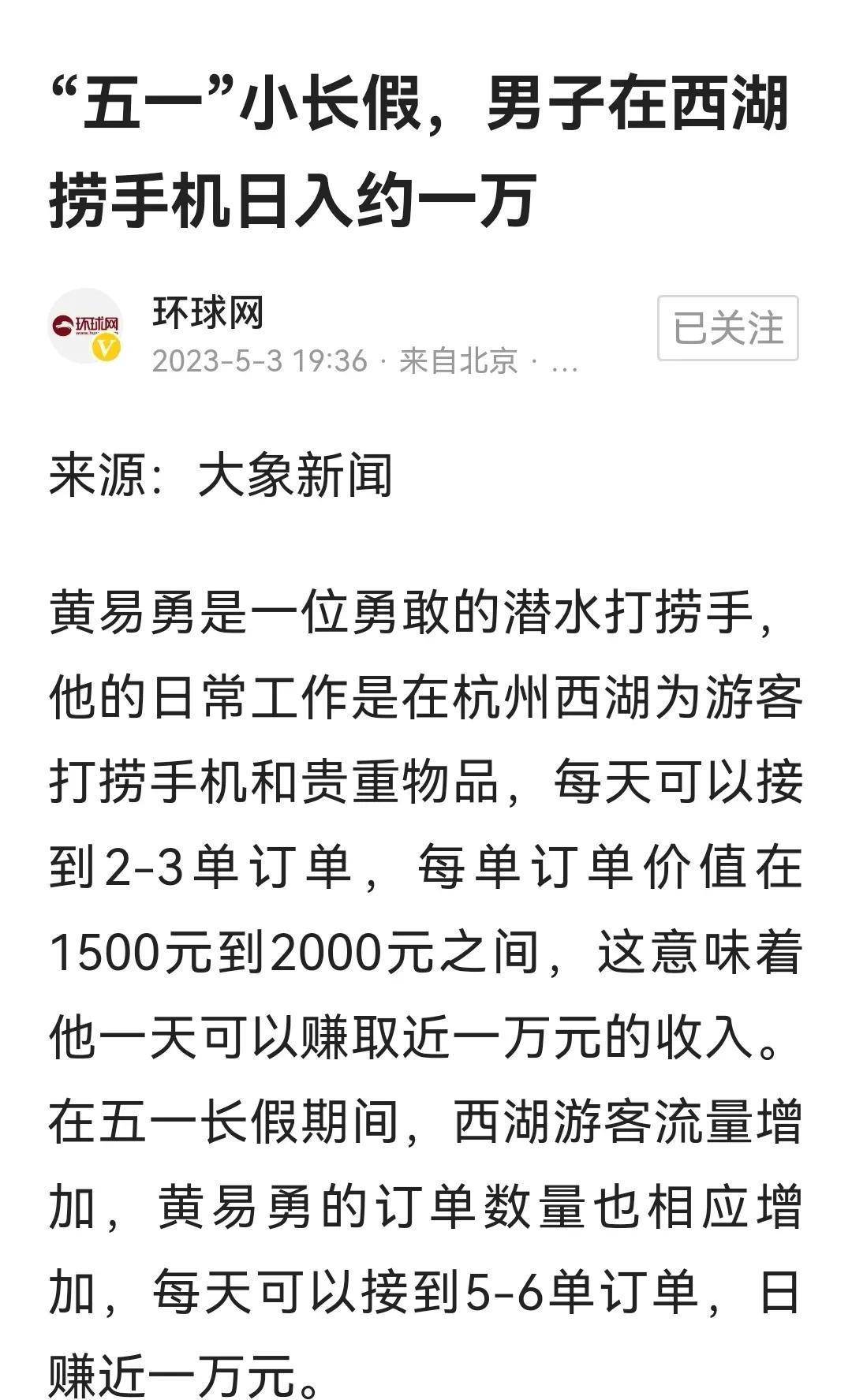 手机掉西湖被要1500元打捞费。捞与不捞,你们怎么看?