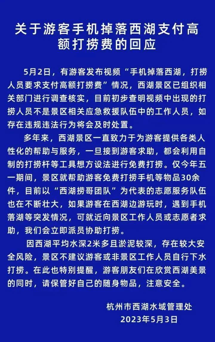 5月3日,杭州市西湖水域管理处回应:5月2日,有游客发布视频“手机掉落西湖,打捞人员要求支付高额打捞费”情况,西湖景区已组织相关部门进行调查核实,目前初步查明视频中出现的打捞人员不是景区相关应急救援队伍中的工作人员,如存在违规违法行为将会及时处置。