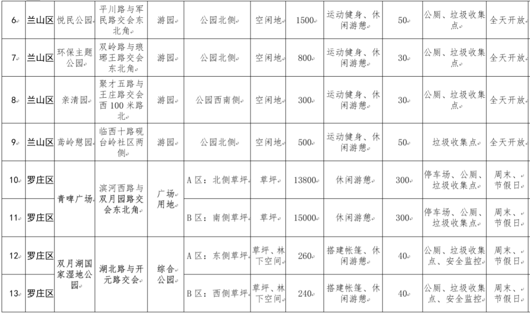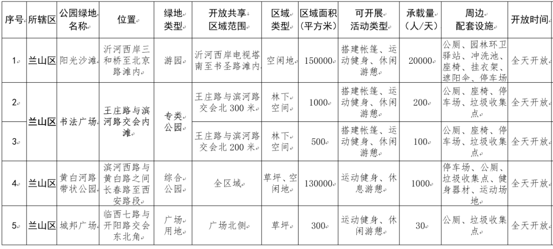 临沂市城市公园绿地开放共享试点台账