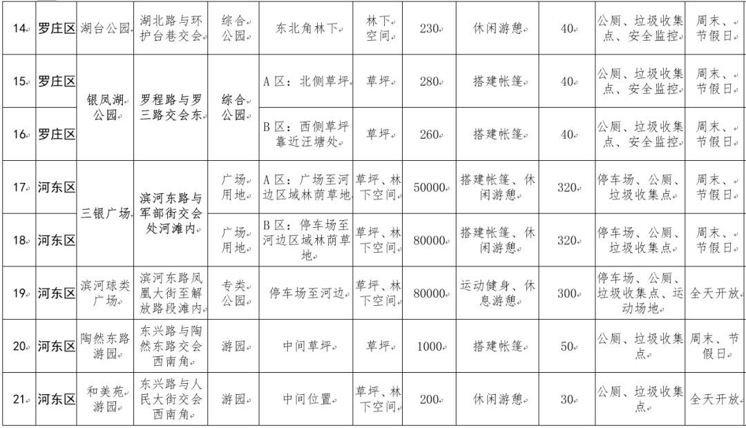 罗庄区共有7处,包括青啤广场(北侧草坪、南侧草坪)、双月湖国家湿地公园(东侧草坪、西侧草坪)、湖(护)台公园(东北角林下)、银凤湖公园(北侧草坪、西侧草坪靠近汪塘处)等,总面积约30070平方米。根据公园相关规划和自身绿地特点,市民可在青啤广场、湖(护)台公园内休闲游憩,可在双月湖国家湿地公园内搭建帐篷、休闲游憩,可在银凤湖公园内搭建帐篷。