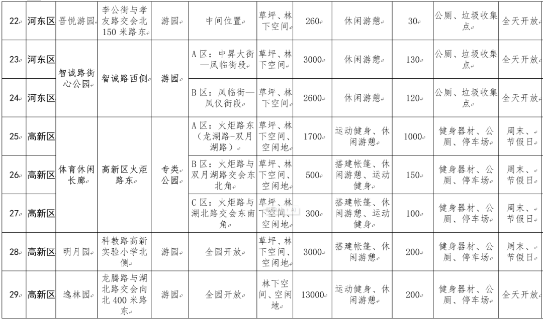 高新区共有5处,包括体育休闲长廊(火炬路东:龙湖路至双月湖路段、火炬路与双月湖路交会东北角、火炬路与湖北路交会东南角)、明月园(全园开放)、逸林园(全园开放)等,总面积约18500平方米。市民可在体育休闲长廊(火炬路东:龙湖路至双月湖路路段)、逸林园运动健身、休闲游憩,可在体育休闲长廊(火炬路与双月湖路交会东北角、火炬路与湖北路交会东南角)搭建帐篷、休闲游憩、运动健身,可在明月园内搭建帐篷、休闲游憩。