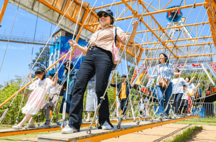5月1日,游客在江西省抚州市南丰县太源乡隆汐湾生态乐园游玩。“五一”假期,人们用多种方式放松休闲,乐享假期。袁智 摄