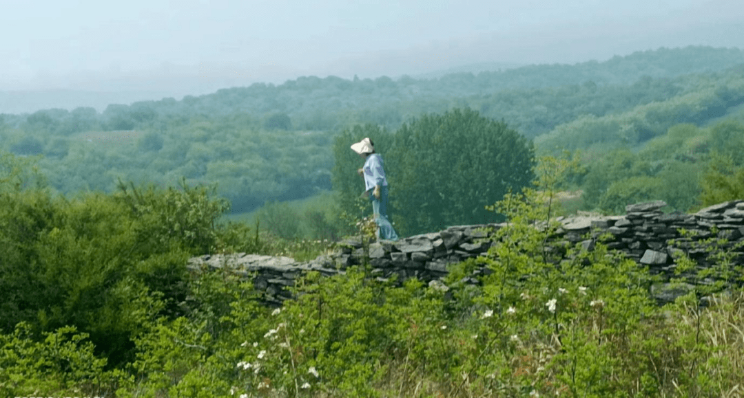 车停稳后,正好遇到一位放羊的当地村妇,向前问询,但她根本不知道什么叫“楚长城”,经用语言和手势描述,才恍然大悟,指着不远处一个山头上簇簇灌木朦胧掩映的、微见石片反光的环形突出带,笑着回答“那不,就是那儿,最近老是有人去那儿照相,但那叫什么“长城”?那就是半山腰一个年代久远的寨子。这个山上的石寨最为完整,把山头盘了一个圈,寨内还有两间石砌房子,但都快倒了。旁边另一个山头上也有寨墙,没有围成圈,还没有路,听老人们讲古代这些寨子曾经是屯兵跑马的地方,解放前还藏过土匪,我们打小跟着大人放羊时就经常在那儿玩耍,全是石头片子,不是长城,说这是长城的人估计是彪(骗的意思)人的”。这妇人真是“相夫育子山凹中,做饭牧羊度人生。只晓长在杏山下,不知常伴楚长城”。在她的指引下,我和史老师及司机三人攀穿过微见陌痕且满是刺玫的山坡,爬了20多分钟才到“楚长城”跟前,其时已经快上午10点钟了。