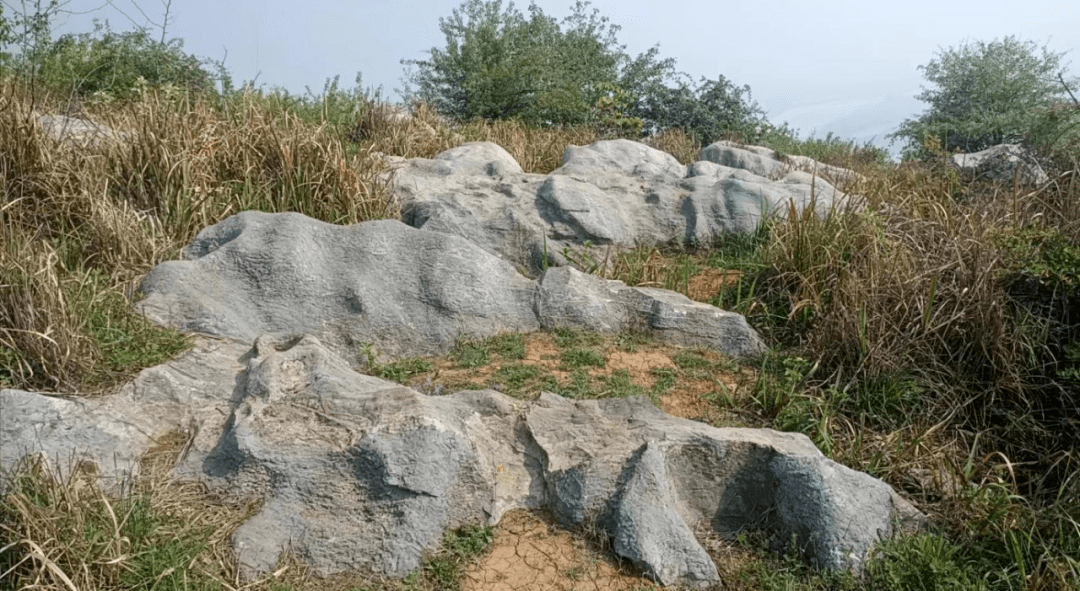 开始上山。当天艳阳高照,气温20多度,而我们走在山路上却丝毫不感到炎热。山风拂来满眼春。几只花喜鹊在眼前不时的上下飞舞、时而驻枝观望,时而起伏鸣叫,似在带路。前行百余步,迎面走来一位农妇正赶着20余只羊下山。俗话说“三羊开泰”,今日上山幸遇羊群,大吉。激动得我家属羊的媳妇赶快抢抓背景拍照,漫山遍野似羊群的杏山溶石和真实的羊群映衬出一幅绝妙的图画,只是自己五音不全,若再和上一首少林寺电影主题曲,配上前面的“邓州杏山省级地质公园”地碑,肯定可以制作成为一段较好的杏山地质公园宣传视频。