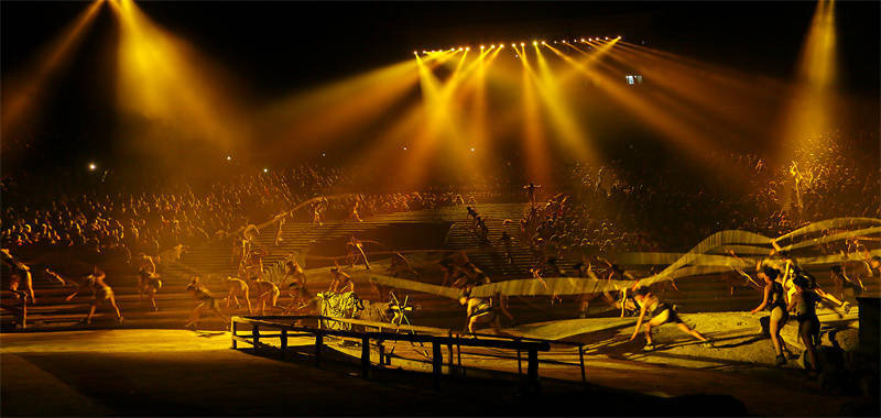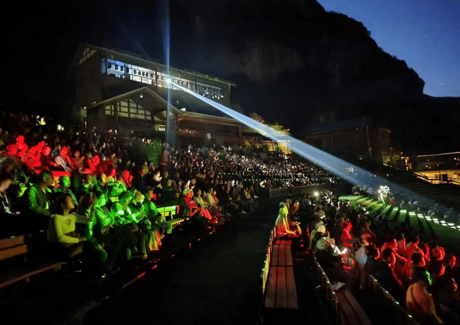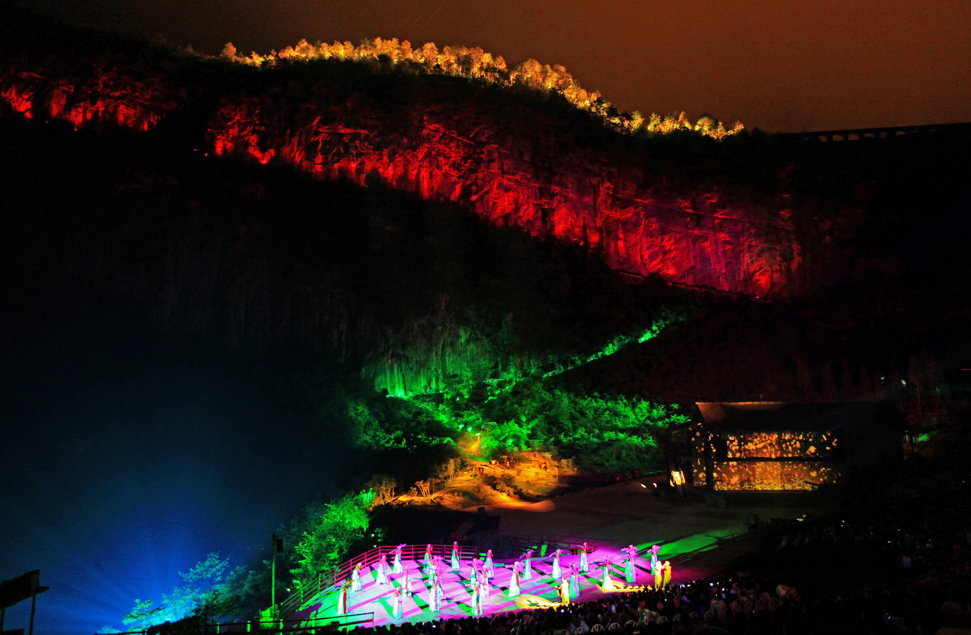 200余名真人演员,就连表演的牛、鸡、狗都是真的,这些也让实景演出更为真实和动人。加之200米峡谷自然音响环绕,制造出如梦如幻的多媒体影音效果,营造出时而高山流水、时而群星璀璨,时而漫天雪飞,时而春和景明的舞美效果,给观众深深的心灵震撼。