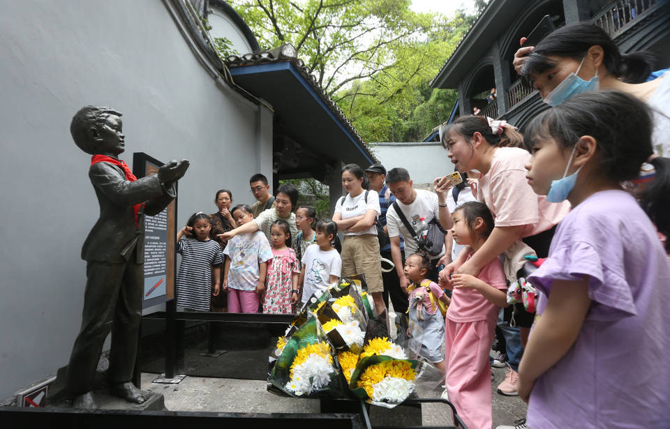 5月2日,沙坪坝,游客们正在白公馆小萝卜头塑像前参观。特约摄影 钟志兵/视觉重庆