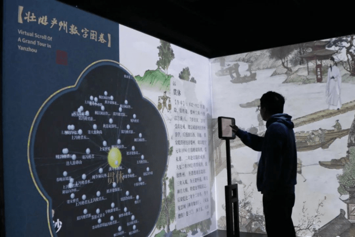 总长达12米的《壮游严州数字图卷》,是严州诗路馆的重点展项之一,图卷由“严州人文星谱”和“数字长卷”两部分组成。“严州人文星谱”基于建德诗路数据图谱,汇聚了名人、诗作及关联地点,游客通过互动屏即可简单查看。